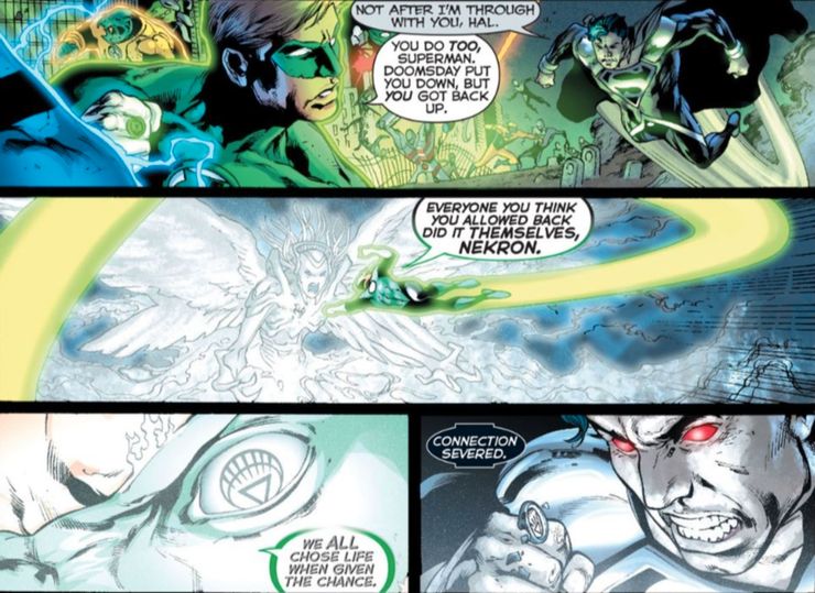 Pocos eventos cómicos han tenido más comentarios sobre la muerte de los superhéroes que la historia de 2009-10. noche más negra de Geoff Johns e Iván Reis. El evento ve al Universo DC invadido por un enjambre de anillos Black Lantern, resucitando héroes y villanos como zombis bajo el control de Lord of the Unliving, Nekron. Como un número de héroes que han regresado de la carga de la muerte en Nekron en La noche más negra # 5, el villano revela que él es quien evitó que tuvieran una muerte permanente y logró que volvieran a la vida. Incluso introduce a la fuerza a héroes como Wonder Woman y Superman en su Black Lantern Corps para demostrar que sus vidas le pertenecen. Sin embargo, en La noche más negra #8 Green Lantern Hal Jordan refuta al villano, diciendo que incluso si Nekron abrió la puerta, él estaba “el que pasoy que lo mismo es cierto para cada héroe que volvió de la muerte.