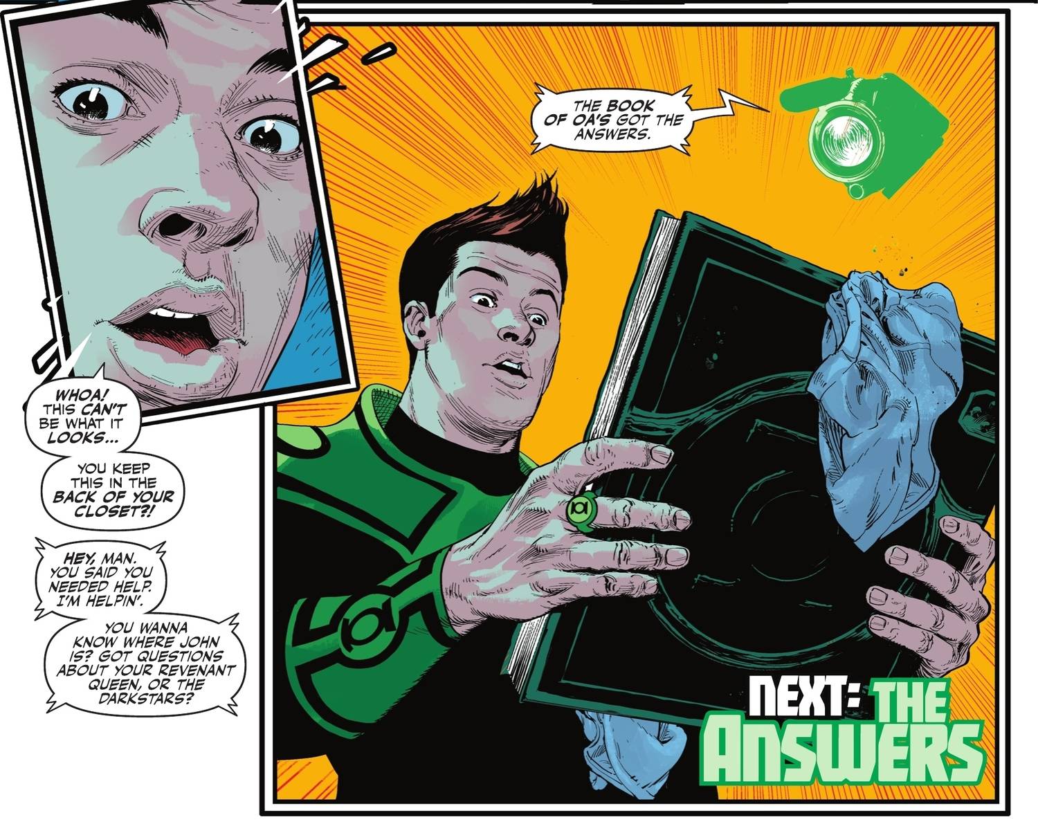 - Green Lantern Caolán Shepherd busca la ayuda de Guy Gardner y descubre el poderoso Libro de Oa escondido por él.