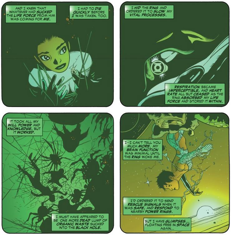 En Cuerpo de Linternas Verdes: Recarga #3 – escrito por Dave Gibbons y Geoff Johns con arte de Patrick Gleason, Prentis Rollins, Christian Alamy y Moose Baumann – se revela una habilidad más oscura. Para escapar de la atención de un grupo de extraterrestres hostiles con forma de araña, la hija de Sinestro, Soranik Natu, usa su anillo para simular un estado de muerte. Para hacer esto, ella no solo ralentiza su metabolismo, sino que en realidad drena su fuerza vital en el anillo. Además, puede ordenar al anillo que envíe señales de rescate a otros Lanterns mientras se encuentra en su estado de muerte, y que la reviva cuando estos Lanterns se acercaron. Todo esto le permite evadir con éxito la atención de los cazadores de recompensas hostiles que tendrían sentido común y la matarían si estuviera viva.