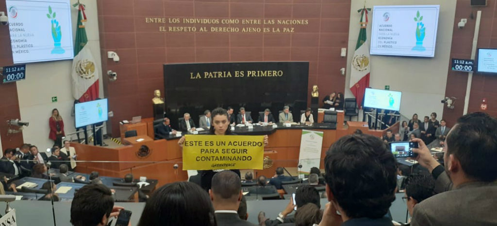 Activistas de Greenpeace México protestaron contra el “Acuerdo Nacional para la Nueva Economía del Plástico en México”, que se firmó este martes en el Senado de la República con la industria del ramo, pues aseguraron que el convenio “es para seguir contaminando”.