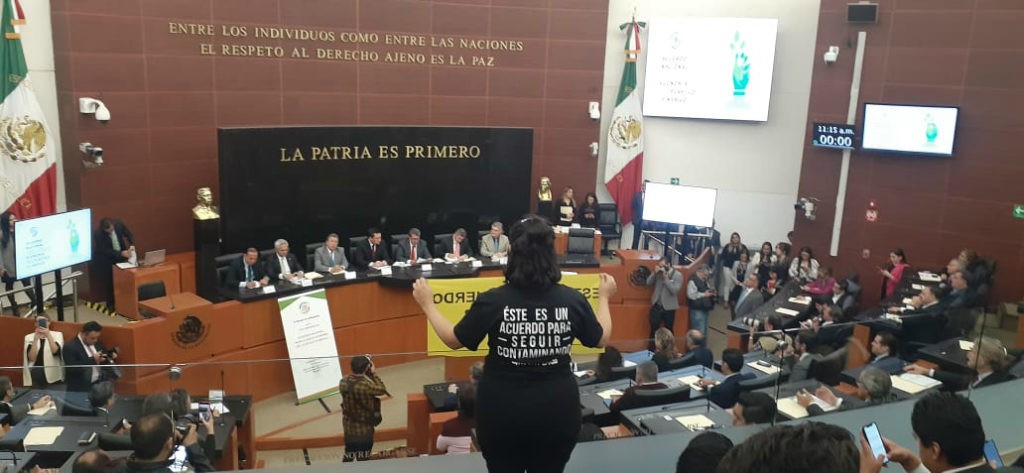 Integrantes de la organización ambientalista ingresaron al salón de la Permanente, donde se realizó la firma del acuerdo impulsado por los senadores Jorge Carlos Ramírez Marín, del PRI, y Ricardo Monreal, de Morena, donde mostraron pancartas con la leyenda “Este acuerdo es para seguir contaminando”.