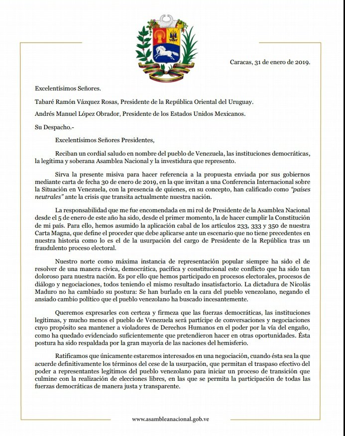 Juan Guaidó, autoproclamado presidente interino de Venezuela, envió una carta a los presidentes de Uruguay, Tabaré Vázquez, y de México, Andrés López Obrador, en la que rechaza participar en un diálogo “cuyo propósito sea mantener a violadores de Derechos Humanos en el poder por la vía del engaño, como ha quedado evidenciado suficientemente que pretendieron hacer en otras oportunidades”.