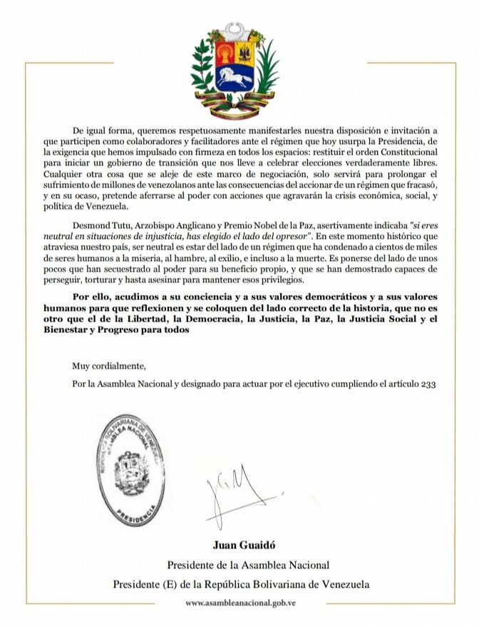 El también presidente de la Asamblea Nacional de Venezuela reiteró que sólo está interesado en una negociación que “permita el traspaso efectivo del poder a representantes legítimos del pueblo venezolano para iniciar un proceso de transición que culmine con la realización de elecciones libres, en las que se permita la participación de todas las fuerzas democráticas de manera justa y transparente”.