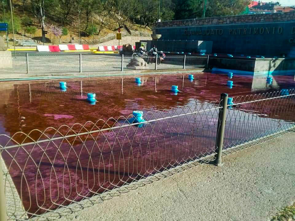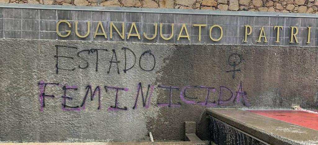 La Fuente de las Ranas fue teñida de rojo mientras el muro fue marcado con la leyenda: Estado Feminicida; Guanajuato es el primer lugar nacional en feminicidios.