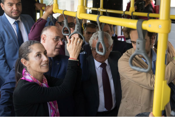 Sheinbaum junto con Andrés Lajous, secretario de Movilidad, y Ramón Jiménez López, director del RTP en el banderazo de 18 unidades de RTP.