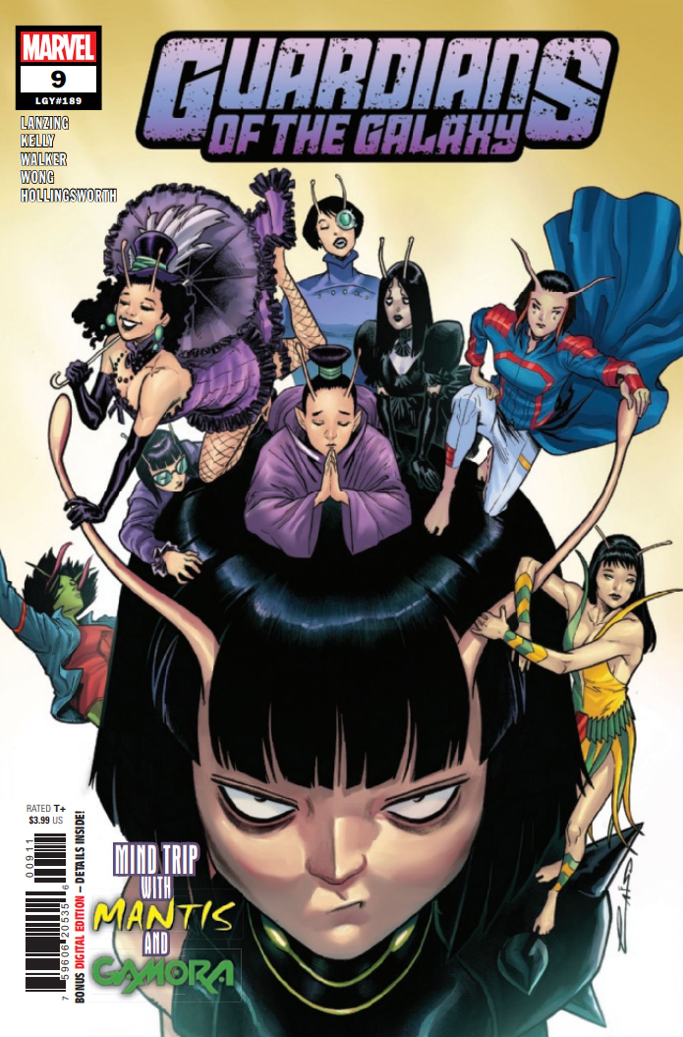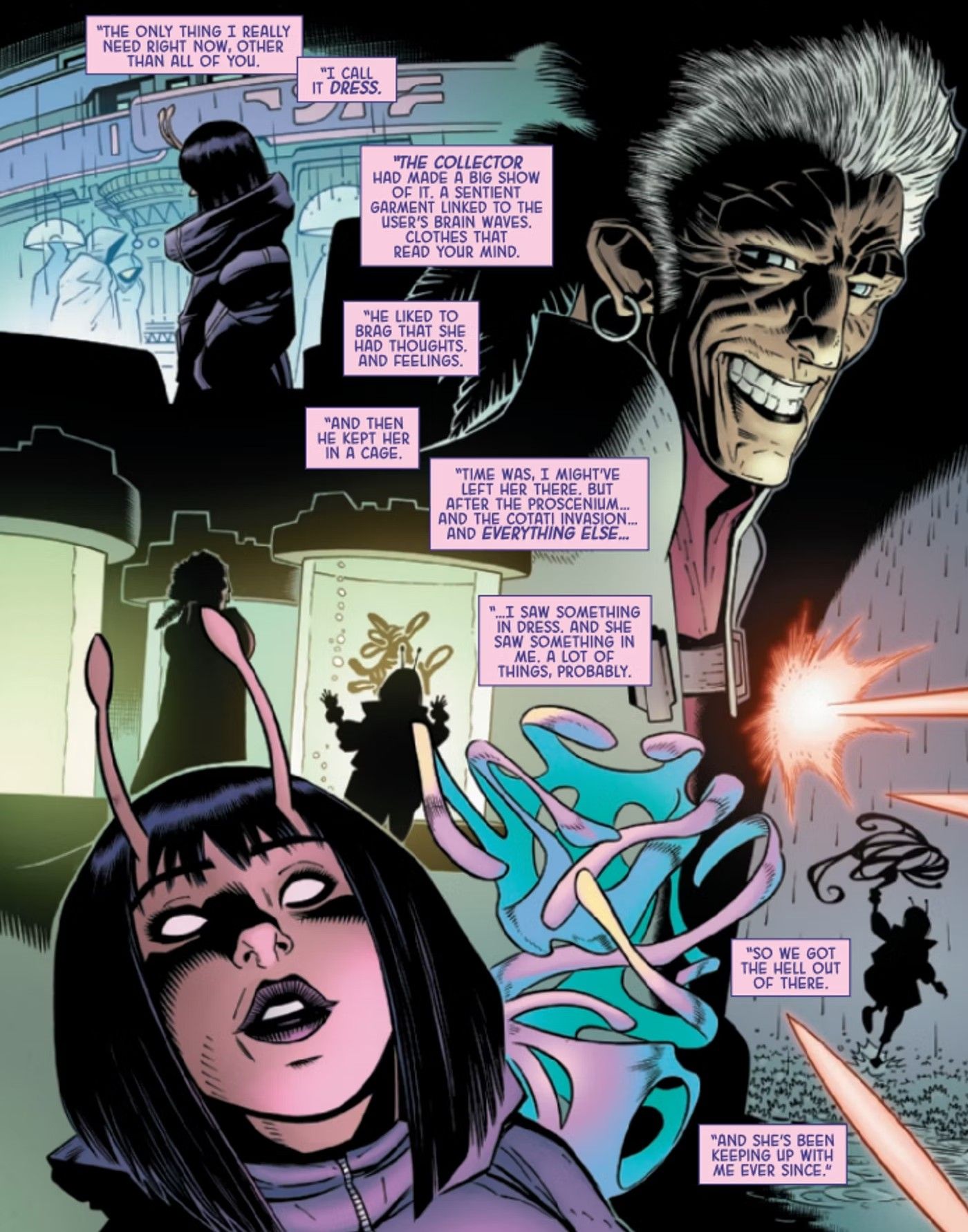 En Guardianes de la Galaxia #9 Por Collin Kelly, Jackson Lanzing y Kev Walker, Gamora y Mantis se dirigen a la Tierra para encontrar al ser sintético conocido como ‘Multitude’ con la esperanza de conseguir la Piedra del Alma para ayudar a Drax. En su viaje, los dos discuten cosas que Groot les dio para conservar sus personalidades desde que se asimilaron a su forma Grootspace. Mantis revela que su artículo es en realidad una prenda viva a la que llama Vestidoque la apega y vincula con su personalidad.