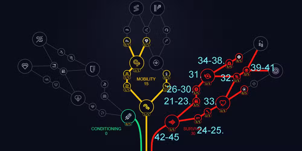 Después de adquirir esta habilidad, querrás maximizar Hombros anchos para aumentar su capacidad de carga total, antes de invertir una vez más en Los restos de un asaltante y Agacharse ágil Antes del nivel 45.