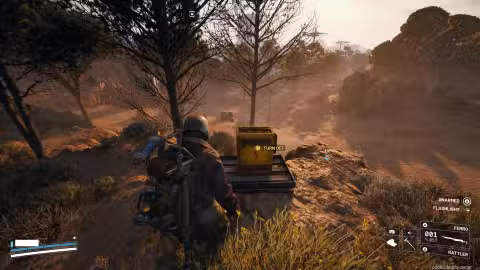Esta segunda captura de pantalla muestra la trampa EMP en sí. Es un poste envuelto en cableado con un aparato circular en la parte superior y se asienta sobre una pendiente de tierra. Para investigarlo, interactuar con la base de la trampa EMP.