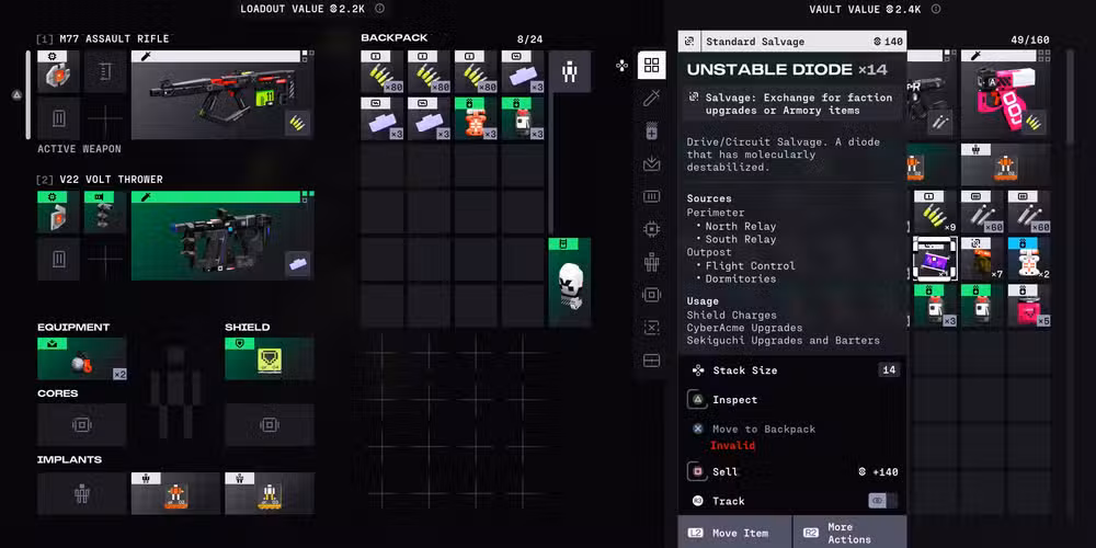 Cerca del final de una carrera, también es importante recordar que Los kits de parches agotados y las cargas de escudo agotadas no se pueden exfiltrar—desaparecerán después de una redada y no te otorgarán créditos. Esto significa que están quemando un espacio de inventario si los conservas. Por lo general, querrás obtener algunas curaciones agotadas mientras saqueas para restaurar el daño del chip, pero puedes eliminarlas de manera segura para obtener mejores elementos.