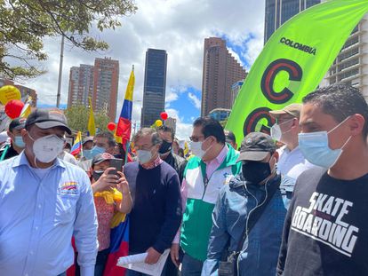 Con otra jornada de protesta nacional, Colombia ha entrado este miércoles en su tercera semana de manifestaciones contra el Gobierno de Iván Duque. Lo hace con una llamativa novedad. Por primera vez, el izquierdista Gustavo Petro, el candidato derrotado por Duque en la segunda vuelta de 2018, se unió a los manifestantes en las calles. A pesar de que no había salido hasta ahora, el exalcalde de Bogotá, que es también el rival a batir de cara a las presidenciales de 2022, ha promovido las protestas y los observadores coinciden en que su aspiración puede capitalizar el descontento social. “Creo que el presidente tiene que reunirse con los delegados de la movilización. Lo demás es carreta [embustes]”, declaró Petro a la prensa mientras marchaba en la tradicional carrera séptima, uno de los varios puntos de concentraciones en la capital.