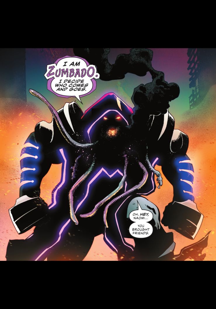 Después de que la Liga de la Justicia derrota a Brutus, Flash le dice al equipo que deben irse ahora. Cuando Naomi responde diciendo que no pueden simplemente irse, Zumbado llega a la escena y les dice que él es quien decide quién puede ir y venir. Él saluda personalmente a Naomi y se da cuenta de que ella “trajo amigos”.