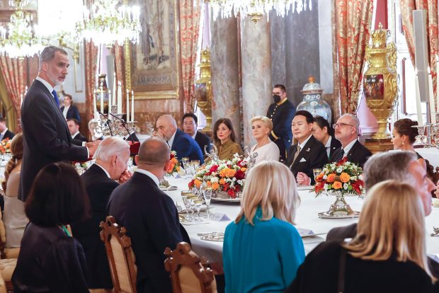 El Palacio Real de Madrid ha sido el escenario de una de las citas más esperadas de los últimos tiempos. Los Reyes don Felipe y doña Letizia ejercieron de anfitriones este martes en la cena de gala con motivo de la celebración de la Cumbre de la OTAN, que ha coincidido además con el cuarenta aniversario de la adhesión de España a la Alianza Atlántica.
