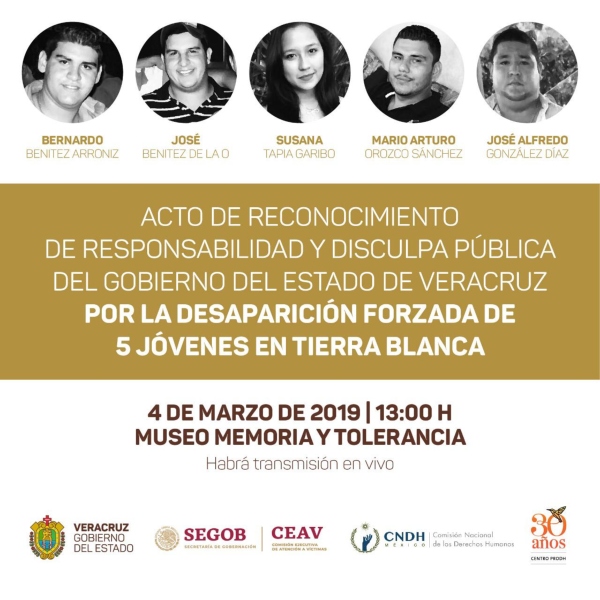 El gobernador Cuitláhuac García Jiménez encabezará el próximo 4 de marzo, el Acto de Reconocimiento de Responsabilidad y Disculpa Pública del gobierno del estado de Veracruz por la desaparición forzada de José Alfredo González Díaz, Mario Arturo Orozco Sánchez, Susana Tapia Garibo, José Benítez de la O y Bernardo Benítez Arróniz, el 11 de enero de 2016.