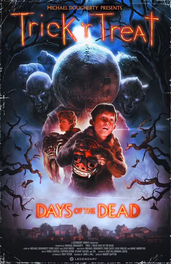 Truco o trato: Días de muertos; Escrito por Michael Dougherty; Todd Casey, Zach Shieds y Marc Andreyko; Arte de Fiona Staples, Stephen Byrne, Stuart Sayger, Zid y Villarrubia