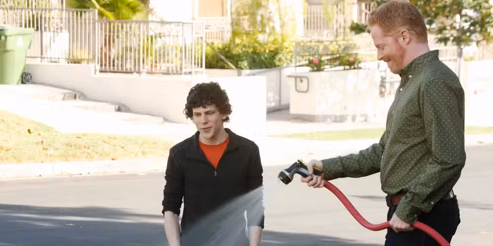 Eisenberg comparte una relación instantánea con Jesse Tyler Ferguson. Sus escenas juntas le dan a Ferguson la oportunidad de interpretar al hombre común y corriente, divertido e inexpresivo, un papel que desempeña espectacularmente, frente a Eisenberg, que realiza esta caricatura satírica perfecta de un ambientalista pasivo-agresivo.