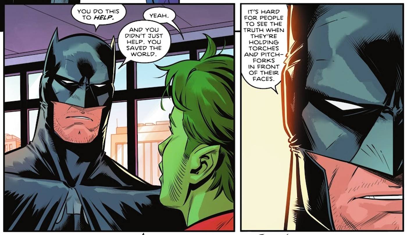 Por otro lado, Batman opera en las sombras al amparo de la noche. Por lo tanto, tiene sentido que Chico Bestia le pida consejo. Chico Bestia le pregunta a Bruce cómo lidia con el hecho de que le desagraden y le teman. En lugar de responder, Batman plantea su propia pregunta: “¿Haces esto para agradar??” Es una pregunta simple pero reveladora. Además, es exactamente lo que Chico Bestia necesita oír. No es un héroe para agradar. Ninguno de los Titanes lo hace por popularidad. Chico Bestia y los Titanes son héroes porque quieren salvar a la gente… y salvaron al mundo.