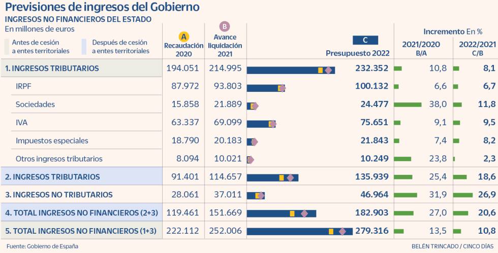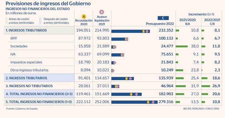 Para encontrar este espacio hay que fijarse en las proyecciones de recaudación de las cuentas. “El aumento de los ingresos tributarios se va a mantener en el próximo ejercicio cuando esperamos que la recaudación crezca un 8,1% respecto a la previsión de cierre de 2021”, que es de un avance del 10,8% tras la caída de 2020”, anunció Montero. “Se trata de una estimación prudente, realista, que se sitúa por debajo de la previsión de crecimiento del PIB nominal, que alcanzaría el 8,6%”, añadió.