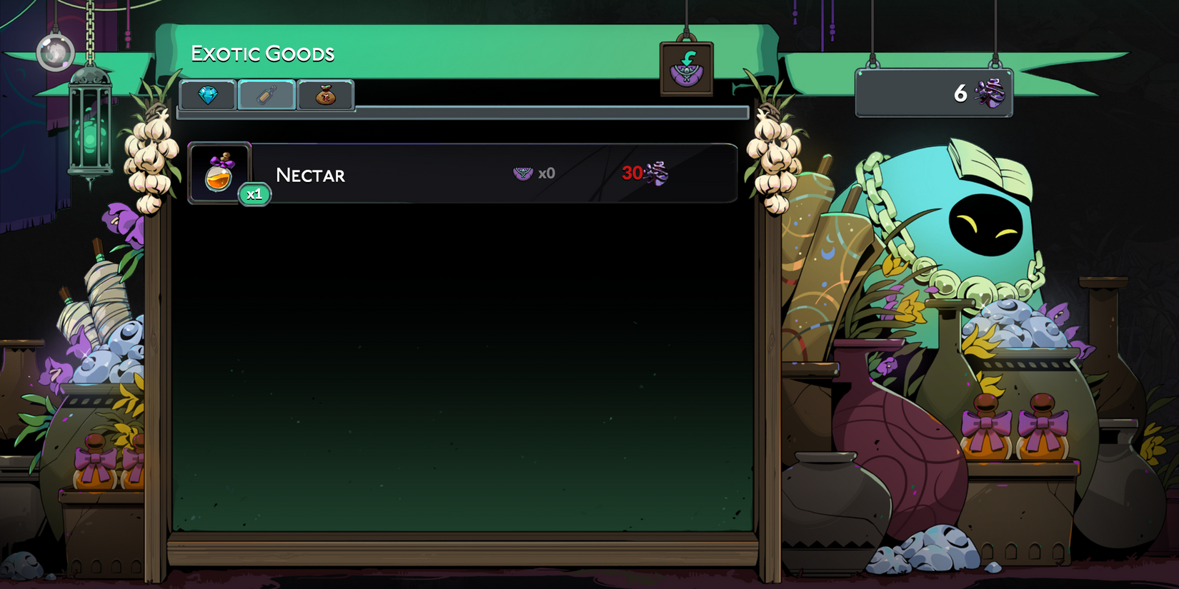este espectro comercia sólo con huesos, así que asegúrate de tener algunos a mano antes de dirigirte a su tienda en Crossroads. Finalmente, El néctar se puede comprar en Caronte.el barquero, durante tus carreras por el oro.