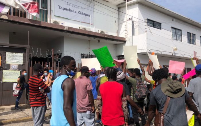 Decenas de migrantes haitianos salieron este lunes a protestar por las calles de Tapachula, Chiapas, para pedir al gobierno mexicano que les agilicen documentos migratorios para poder avanzar legalmente hacia el norte del país.