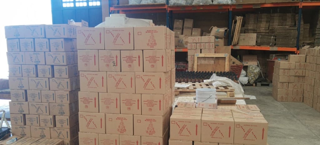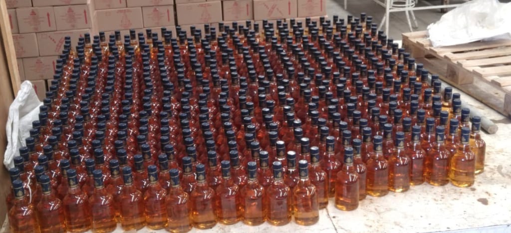 “Además, se decomisaron planillas de etiquetas adheribles, cientos de cajas de cartón impresas con logotipos e imagotipos de marcas comerciales de bebidas etílicas, botellas de vidrio vacías y paquetes de taparroscas, así como botellas conteniendo alcohol etílico desnaturalizado”, informó la Fiscalía.