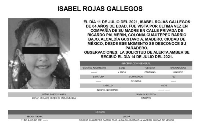 La Fiscalía General de Justicia de la Ciudad de México informó este sábado que localizó sin vida a la niña de 4 años reportada como ausente Isabel Rojas Gallegos, quien fue vista por última vez el pasado 11 de julio junto a su madre en la colonia Cuautepec, Barrio Bajo, alcaldía Gustavo A. Madero.