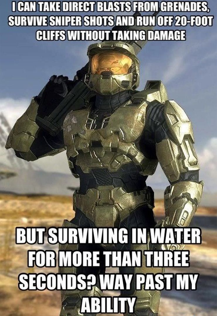 Muy pocos aureola Los memes son tan ciertos como este. A pesar de toda la fuerza y las capacidades del Jefe Maestro, es un fracaso en el agua. Puede recibir un disparo, volarlo por los aires, aplastarlo o tirarlo a través de una habitación, pero aún así se levanta y se va a por todas. Sin embargo, si se mete en un cuerpo de agua, son cortinas para él.