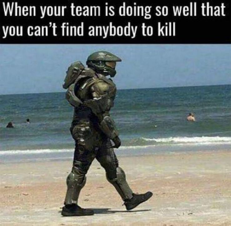 Este meme disfruta burlándose un poco del concepto de ser el compañero menos capaz en un equipo multijugador. Hay momentos en que aureola los jugadores son tan buenos que terminan limpiando el piso con la fuerza opuesta, sin dejar objetivos para jugadores casuales o recién llegados.