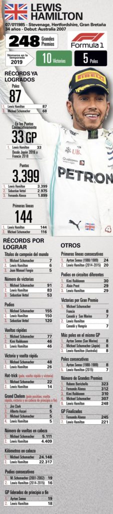 “Nunca había pensado que podía conseguir cinco títulos. Si puedo lograr el sexto, me parecerá algo irreal. No creo que haya alcanzado la cima todavía, mi plan es seguir volviéndome aún más fuerte”, decía Lewis antes de proclamarse ayer hexacampeón del Mundo de F1, muestra precisamente de que Lewis no se conforma con todos los logros cosechados hasta ahora. Es el piloto con más poles, el que más puntos ha conseguido de la historia, el que ha encadenado más Grandes Premios consecutivos puntuando, el que más primeras líneas ha cosechado, y tras un gran 2019, en el que ha conquistado 10 triunfos por ahora, tiene en el 2020 un año clave para seguir batiendo registros históricos.