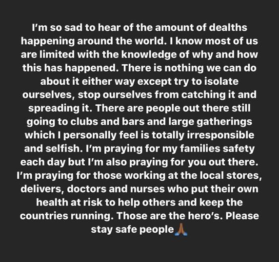 “Estoy tan triste de escuchar la cantidad de muertes que están ocurriendo en todo el mundo. Sé que la mayoría de nosotros nos sentimos limitados por no saber por qué y cómo ha pasado esto. No hay nada que podamos hacer salvo intentar aislarnos, evitar contagiarnos y contagiar a los demás.