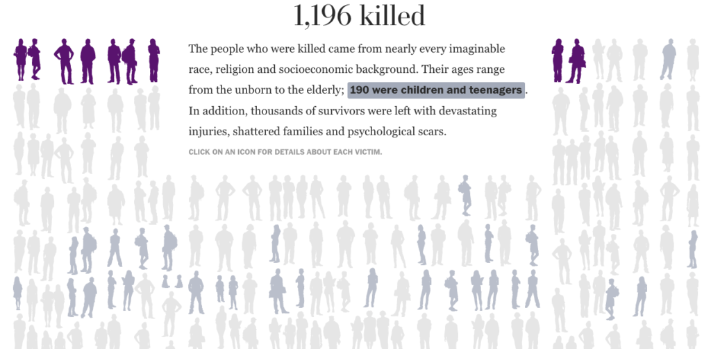 De acuerdo con el diario, las personas asesinadas provenían de casi todas las razas, religiones y antecedentes socioeconómicos. Sus edades van desde los no nacidos hasta los ancianos; 190 eran niños y adolescentes. Además, miles de sobrevivientes quedaron con heridas devastadoras, familias destrozadas y cicatrices psicológicas.