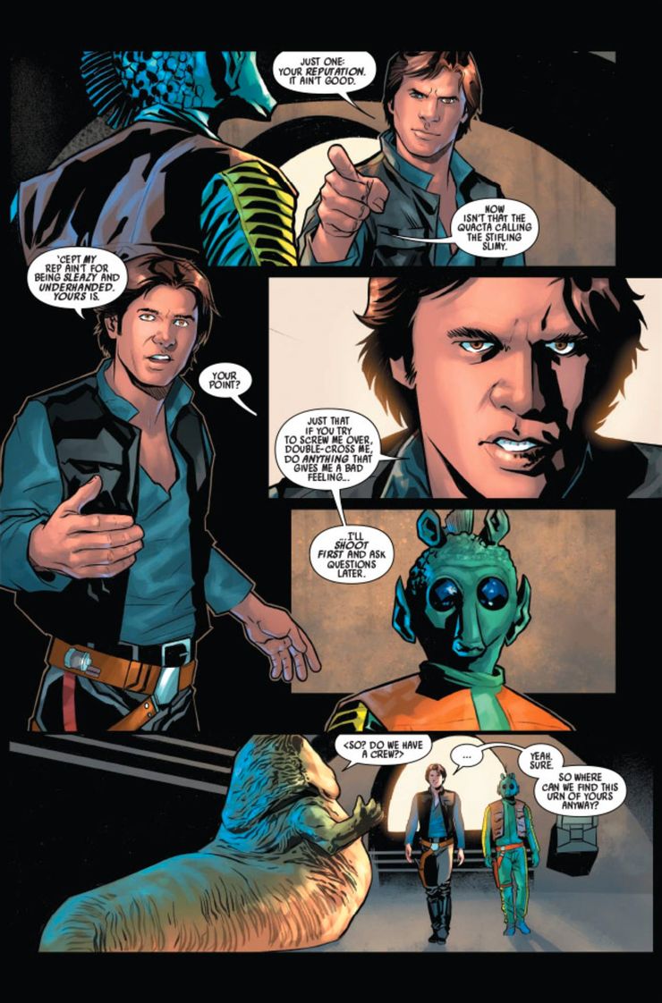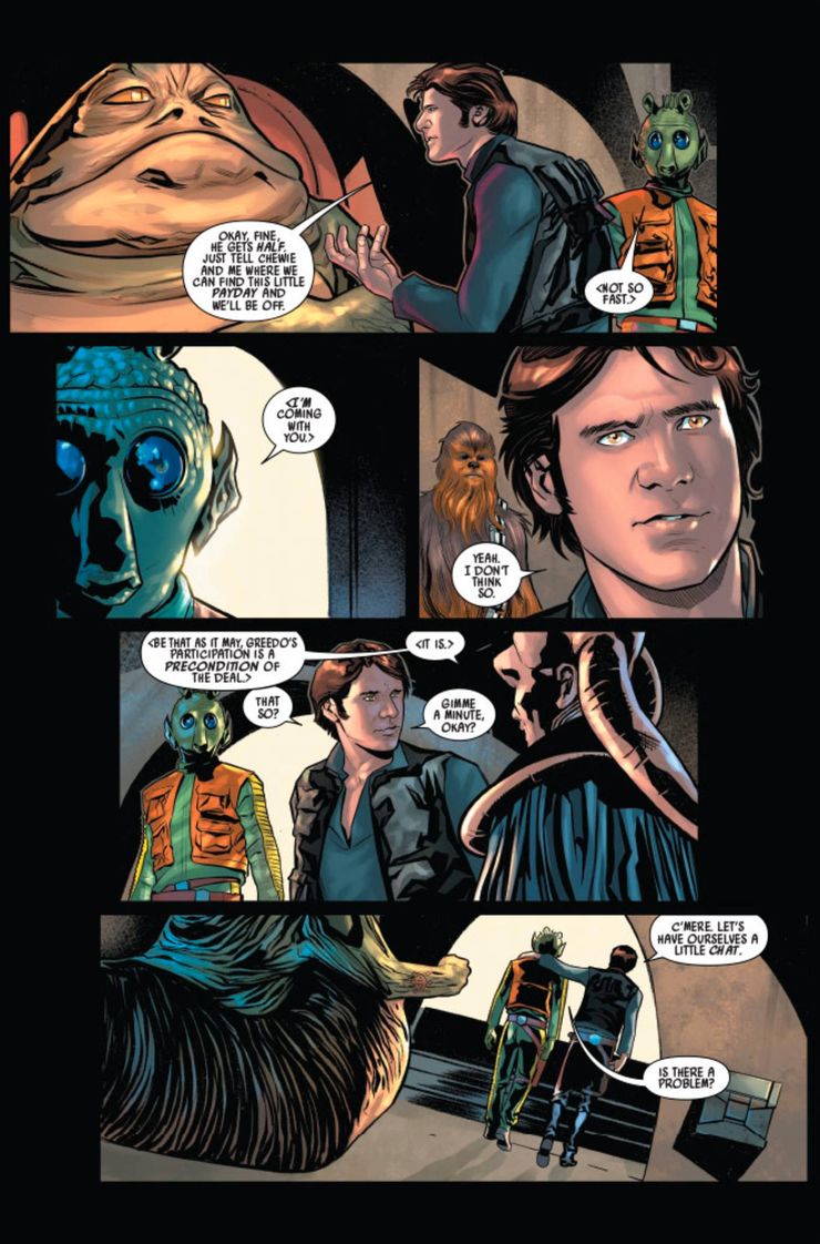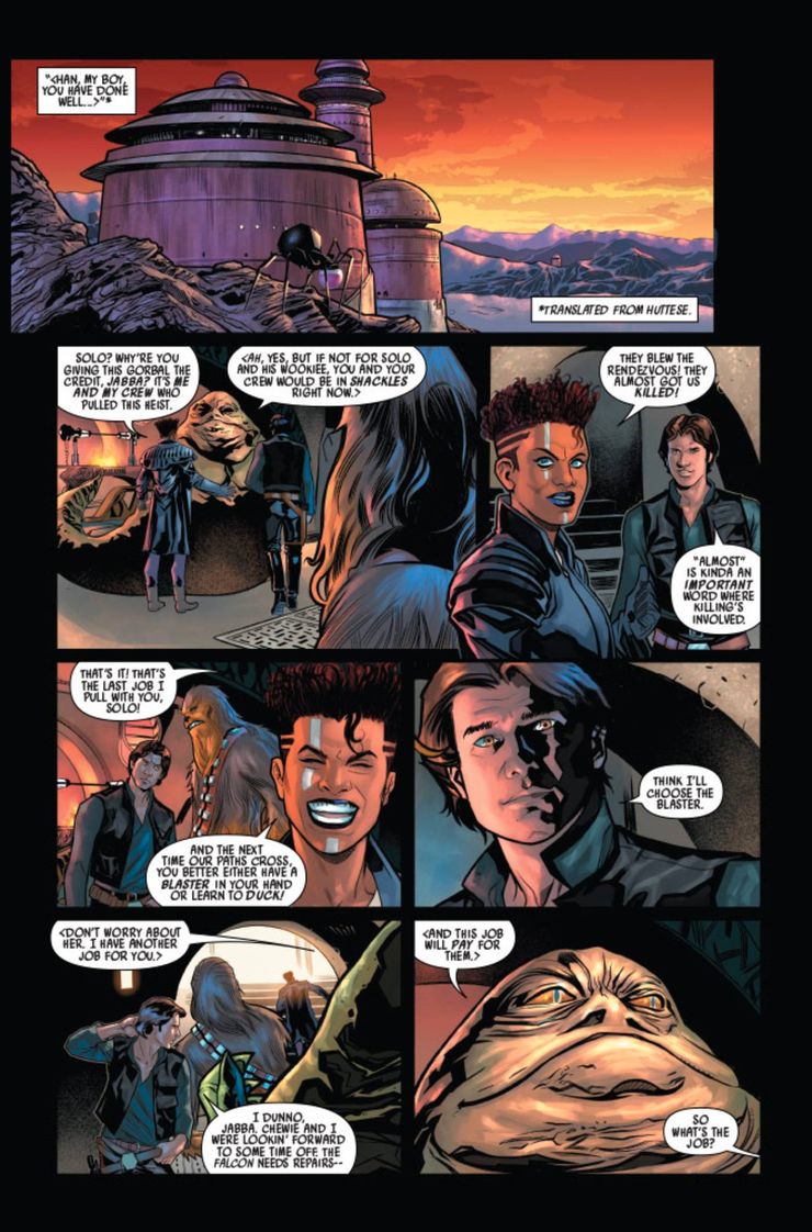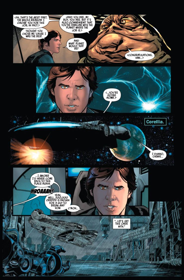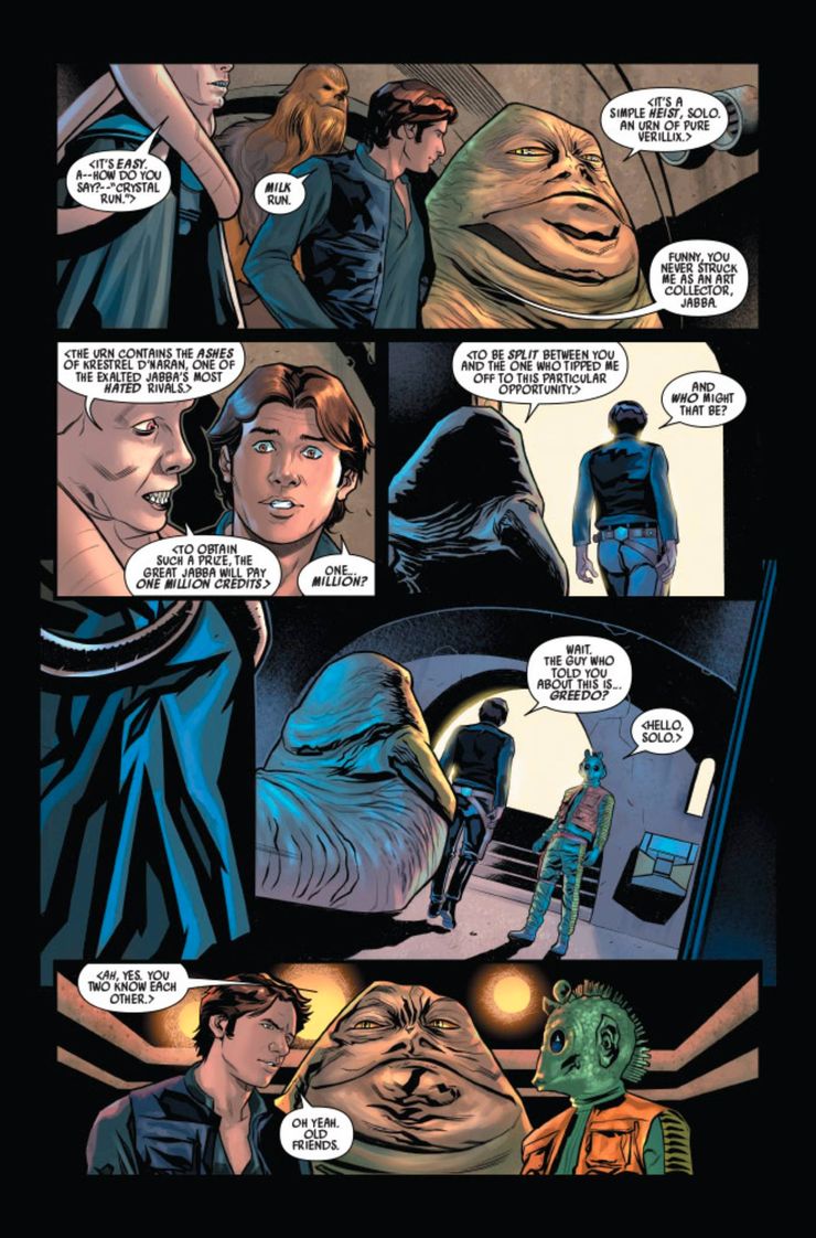 En las páginas publicadas del primer número, Jabba analiza el atraco con Han y Chewie antes de que se dirijan a reparar el Halcón Milenario. Su relación puede ser surrealista para algunos fanáticos, ya que la trilogía original los enfrentó entre sí. Mientras Greedo se abre camino en la misión, Jabba revela que eligió a Han por una razón. El planeta en el que tiene lugar el atraco es Corellia. Jabba le dice al contrabandista, “Pero también es conveniente que estés familiarizado con el planeta donde está el trabajo”. Han pregunta: “¿Y qué planeta sería ese?” “Felicitaciones, Han… te vas a casa”. Aunque tiene sentido que Jabba pueda utilizar la conciencia de Han sobre Corellia a su favor, es extraño que esté al tanto de los orígenes de Han, ya que la línea de trabajo de un contrabandista tiende a ser impersonal.