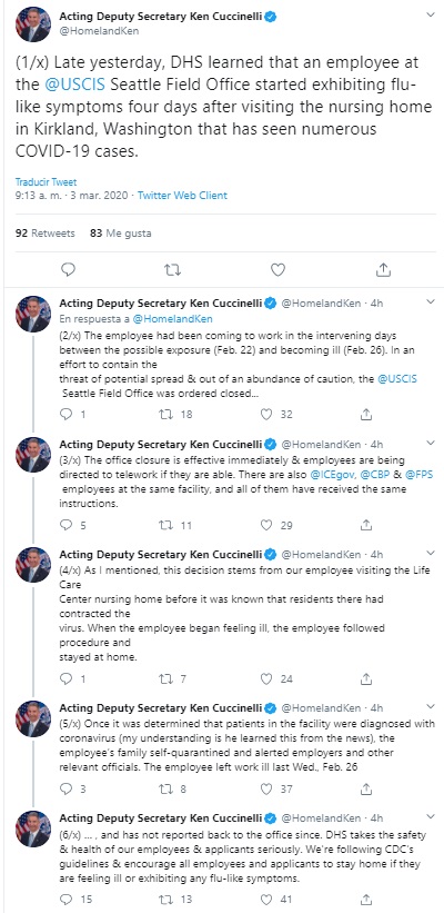 Ken Cuccinelli, director General Adjunto del DHS, aseguró por medio de su cuenta de Twitter que seguirán los protocolos recomendados por los Centros para el Control y Prevención de Enfermedades (CDC) para evitar mayores contagios.