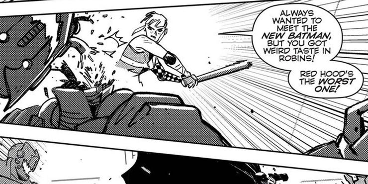 En Future State: Gotham # 11 de esta semana de Dennis Culver, Geoffo, Jordie Bellaire y Troy Peteri de ALW, Red Hood lidera la batalla contra los robots cibernéticos del Magistrado, a quienes el próximo Joker se ha hecho cargo. Junto a Hunter Panic, Tobias Whale y Batman, Jason Todd sugiere evitar a los robots y esconder a Whale en una casa segura. Sin embargo, Harley Quinn tiene otras ideas, ya que descubre su tapadera al perseguir inmediatamente a los Jokerbots. Al ver a Batman con Caperucita Roja, Harley Quinn le dice al futuro Caballero Oscuro que tiene un “gusto extraño en Robins”, ya que ella odia más a Caperucita Roja, ya que él es “el peor una.”