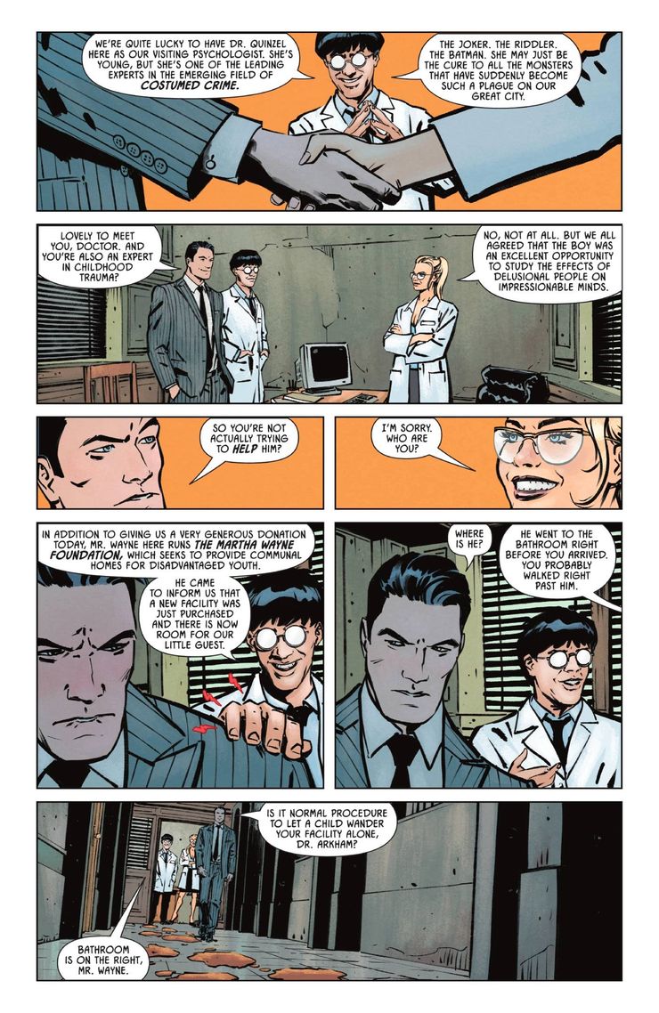 Durante una secuencia de flashback, la Dra. Harleen Quinzel habla con un niño que se había encontrado con el Joker. La entrevista parece ser un día típico en el trabajo, ya que ella evalúa su estado psicológico considerando su posible trauma. Después de que él sale de la habitación y ella vuelve a reunirse con otros, se revela que ella ve al niño como alguien de quien aprovecharse, aprendiendo sobre el impacto de las personas delirantes en las mentes de los jóvenes. Cuando Bruce le pregunta, “¿Así que en realidad no estás tratando de ayudarlo?” ella responde, “Lo lamento. ¿Quién eres tú?”