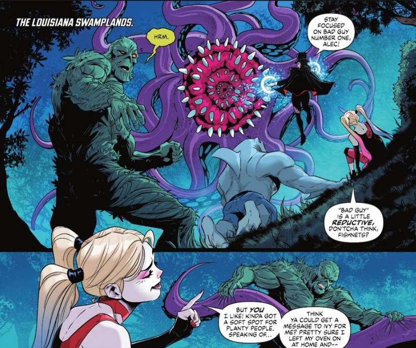 Harley luego cambia su atención a Swamp Thing y dice: “Pero tú ¡Me gusta!” con el uso de “pero“reforzando su desagrado hacia Zatanna. Hablando directamente con Alec, Harley le explica que le gusta por su “debilidad por la gente vegetal.” Este es un guiño directo al socio de toda la vida de Harley, Poison Ivy, sugiriendo que Swamp Thing se ha ganado su respeto gracias a sus pasadas bondades hacia Ivy.. Además, Swamp Thing e Ivy han colaborado recientemente en G. Willow Wilson. Hiedra venenosa carrera, lo que también puede contribuir al respaldo de Harley. En cualquier caso, está claro que Swamp Thing ha recibido su sello de aprobación.