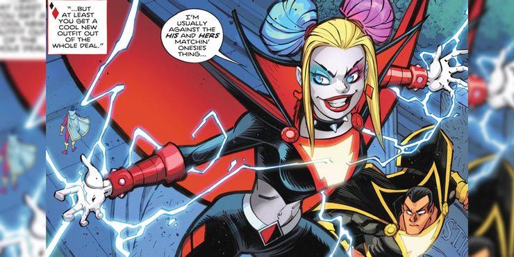 En “Lightning in a Bottle”, la historia comienza con Harley Quinn etiquetando el Salón de la Justicia con grafitis. Pronto se encuentra con Shazam (a quien se refiere como un gran queso rojo tonto), quien le pide que limpie el desastre. Entonces, naturalmente, Harley ataca pero termina en prisión. Sin embargo, en el proceso, capta la atención de Black Adam, quien la libera y le ofrece la oportunidad de ser su reina. La oferta es por razones puramente políticas, ya que cree que Quinn sería un líder fuerte y tenaz. Harley acepta después de que le digan que obtendrá poderes en el papel ya que obtiene su propio traje de rayo.
