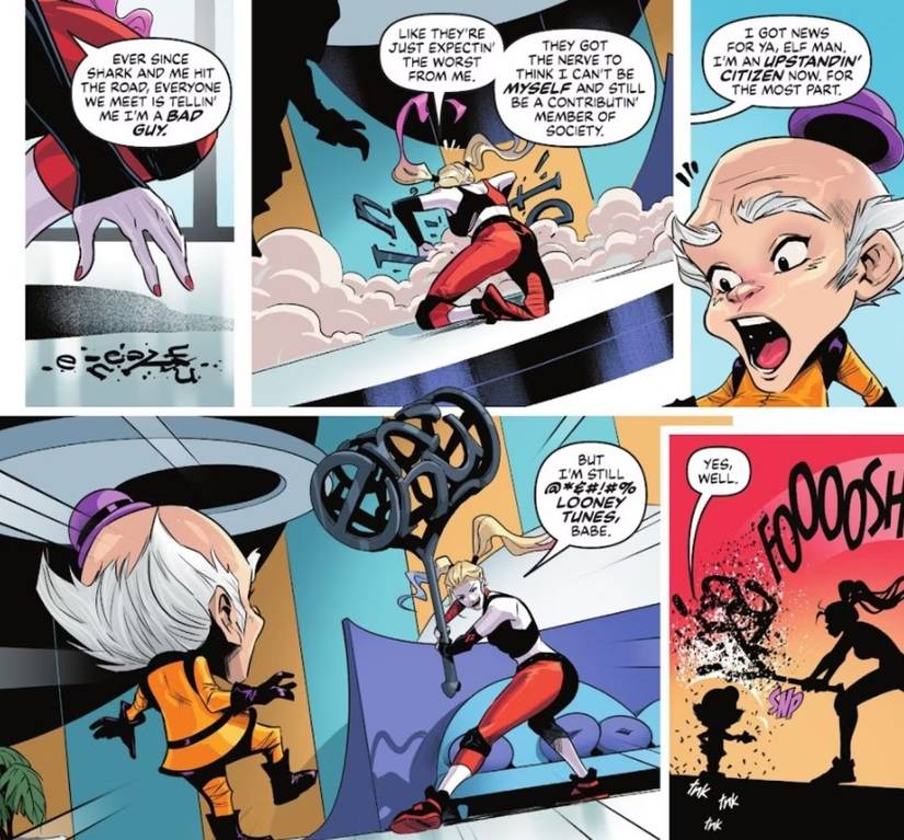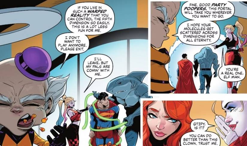 Sin embargo, los planes de Harley para la celebración de Nanaue se topan con un obstáculo cuando, sin querer, se encuentran con varios miembros de la Liga de la Justicia, incluido Superman, quien termina siendo secuestrado por el señor Mxyzptlk. Es durante este encuentro que Harley revela su habilidad para controlar la quinta dimensión, colocándola a la par de algunos de los seres más poderosos de DC.