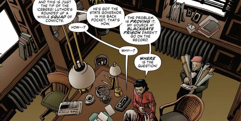Formada no por Amanda Waller sino por Gotham a la luz del gasEl último equipo del Escuadrón Suicida, Lex Luthor, es descubierto por Lois Lane mientras investiga las turbias prácticas comerciales de Luthor, ya que Lois cree que Luthor ha reclutado recientemente a lacayos “directamente del corredor de la muerte” como su propio “escuadrón de convictos”. Mostrando a su editor, Perry White, Fotografías policiales del villano del vodevil, el cocodrilo cajún y el asesino a sueldo. — Harley Quinn, Killer Croc y Deadshot, respectivamente — Lois explica que que Luthor utilice a estos criminales para “destrozar a la competencia” es algo que debe tomarse en serio, incluso si aún no puede probarlo.