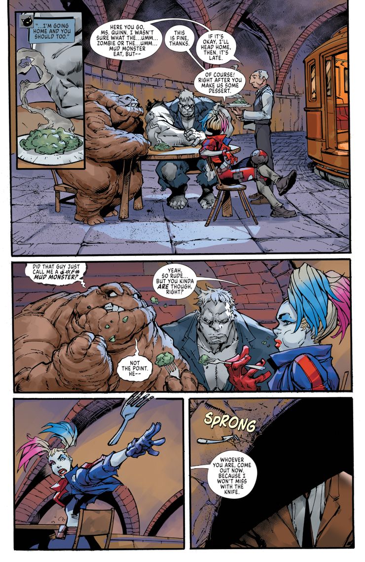 Ahora, una nueva vista previa muestra a Harley Quinn todavía viva y amándola durante los últimos tiempos vampíricos. En el nuevo DC vs Vampiros: Asesinos #1 de Matthew Rosenberg y Mike Bowden, Harley ha formado una nueva pandilla de pícaros en Gotham City y se ha apoderado del inframundo criminal a raíz de la revolución vampírica. Junto con Catwoman, Clayface y Solomon Grundy, Quinn ciertamente tiene un poder impresionante detrás de ella. Aquí están las páginas de vista previa y la sinopsis del próximo número: