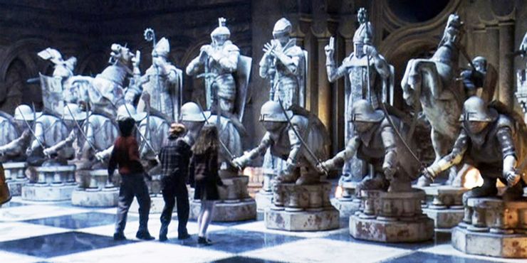 A partir de principios de harry potter y el piedra del hechicero, Ron toma una decisión difícil y le dice a Harry cómo lograrán llegar al final del juego de ajedrez de tamaño natural. Este es un momento en el que vemos a Ron mostrando extrema lealtad y paciencia. Se está sacrificando para que El Elegido continúe porque sabe que eso es lo que debe hacer.