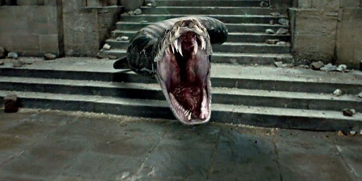 Hacia el final de la Reliquias de la Muerte: Parte 2, Voldemort se tambalea y se enfurece cuando Harry regresa de entre los muertos. Él y su banda de Mortífagos atacan el castillo con renovado vigor, con Nagini la serpiente a cuestas. Y el monstruo casi les hace a Ron y Hermione su cena de la noche.