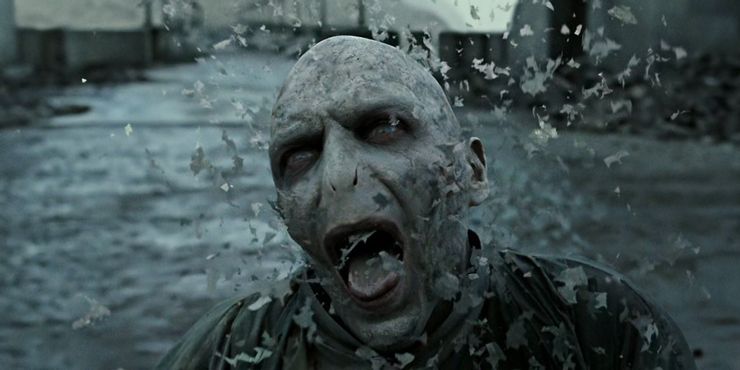 En el libro, las últimas palabras de Voldemort fueron las mismas que le había dicho a Harry cuando era bebé: Avada Kedavra. Al igual que antes, la maldición asesina se recuperó, pero esta vez a Voldemort no le quedaban Horrocruxes para salvarlo.