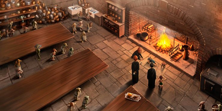 Harry y Ron aman su tiempo en las cocinas, con los elfos bombardeándolos con comida. Hermione, no tanto, sin embargo, con el estudiante más brillante de Hogwarts sorprendido por lo felices que son, a pesar de trabajar sin dinero en absoluto.