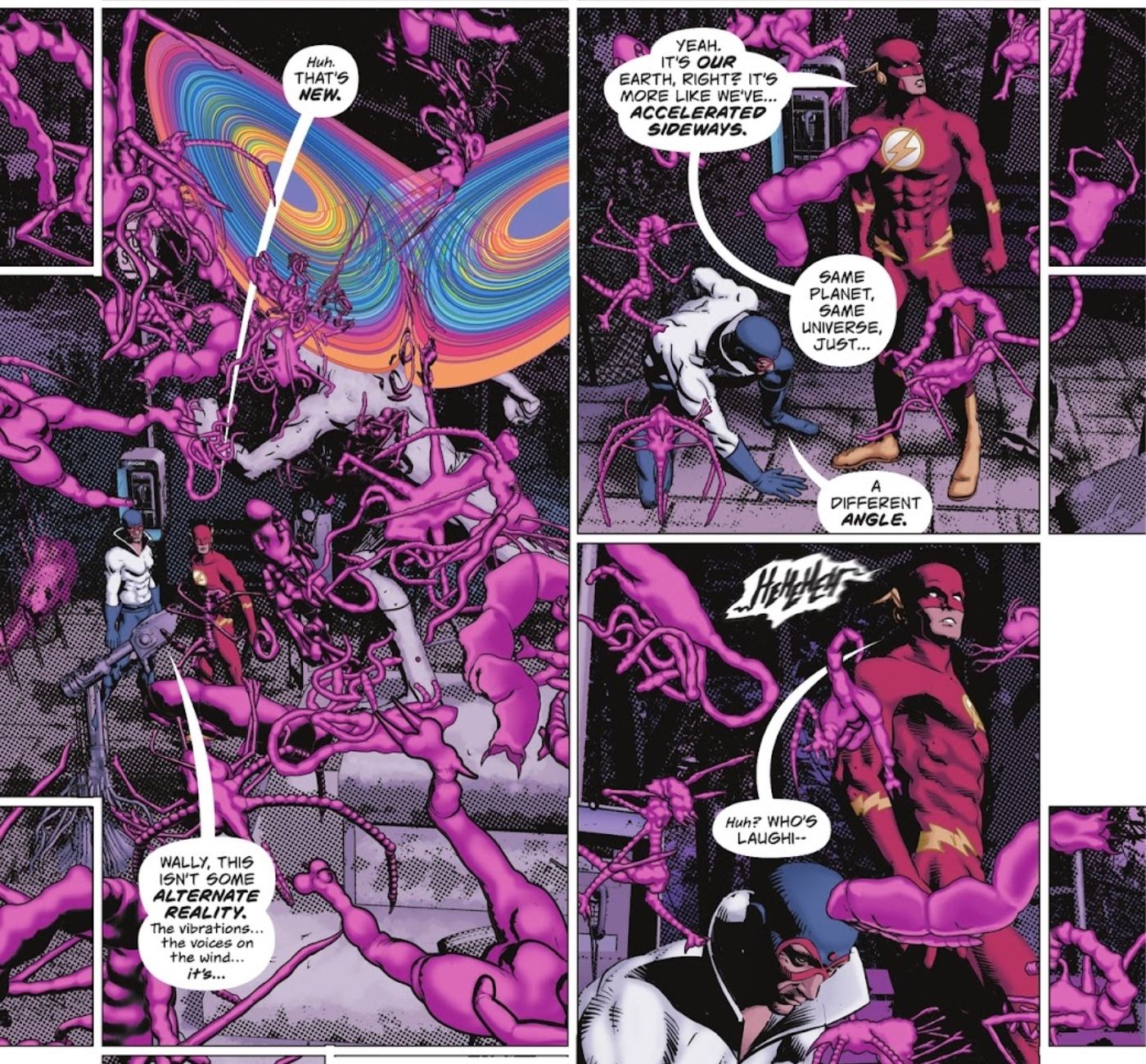 - La nueva aventura de Flash revela que sus poderes van más allá de lo que los fanáticos creían anteriormente, y se revela que Wally West tiene la capacidad de cambiar el ángulo a través del cual interactúa con la realidad.