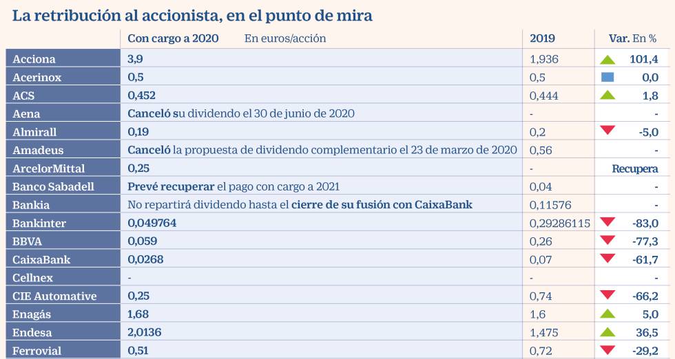 En el lado de las cotizadas que recuperan el pago al accionista se sitúa ArcelorMittal, que abonará un dividendo de 0,25 euros por título. Con las limitaciones impuestas por el Banco Central Europeo, los bancos han optado por recuperar el dividendo. De acuerdo a lo establecido por el supervisor, las entidades podrán repartir como mucho el 15% del beneficio acumulado de 2019 y 2020, que no podrá superar el equivalente a 20 puntos básicos de la ratio de capital CET 1. Sabadell es la única que no retribuirá este año a sus accionistas, mientras Bankia está a la espera de que se cierre la fusión con CaixaBank para anunciar sus planes.