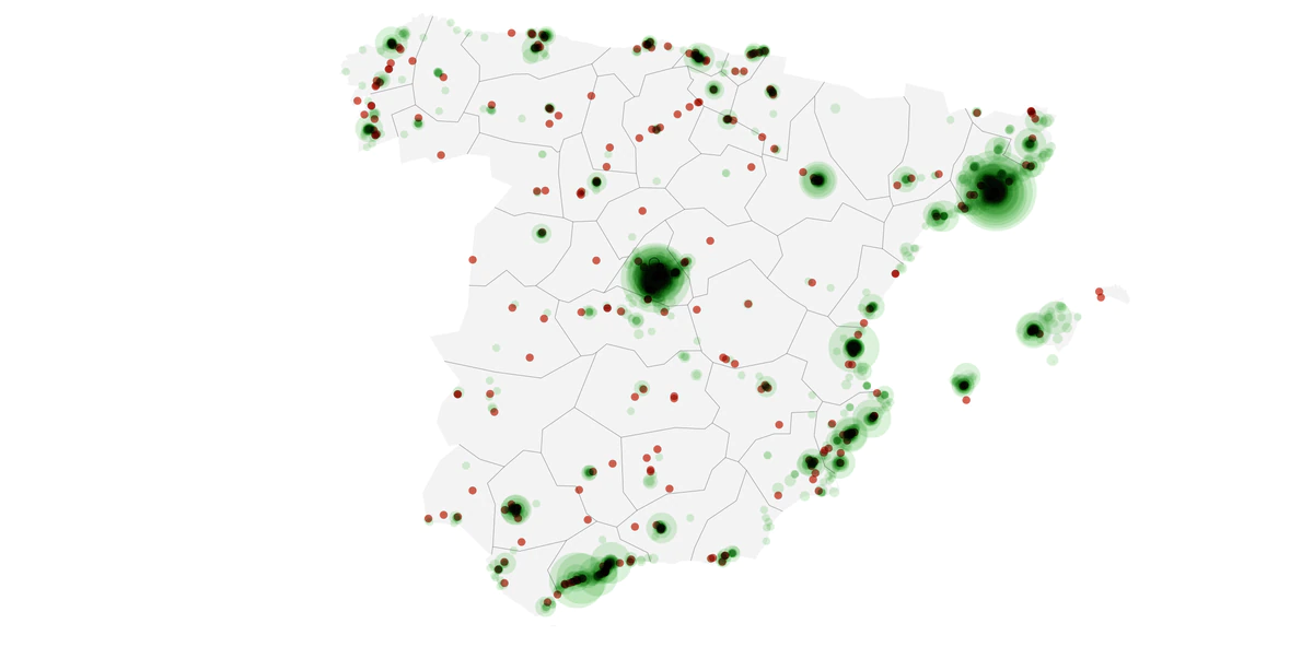 La importancia del centro de las ciudades se ve con más claridad en los mapas de Madrid y Barcelona: “Al observar en conjunto todos, se capta perfectamente la concentración de las ubicaciones de acuerdo con un patrón reiterado. En primer lugar, merece destacarse la relevancia que tienen tres núcleos urbanos, como son Madrid, Barcelona y Valencia”, dice Ariño. “Y junto al corredor Mediterráneo deben sumarse también, por la economía turística y el trasiego de visitantes, las Islas Baleares”, añade.