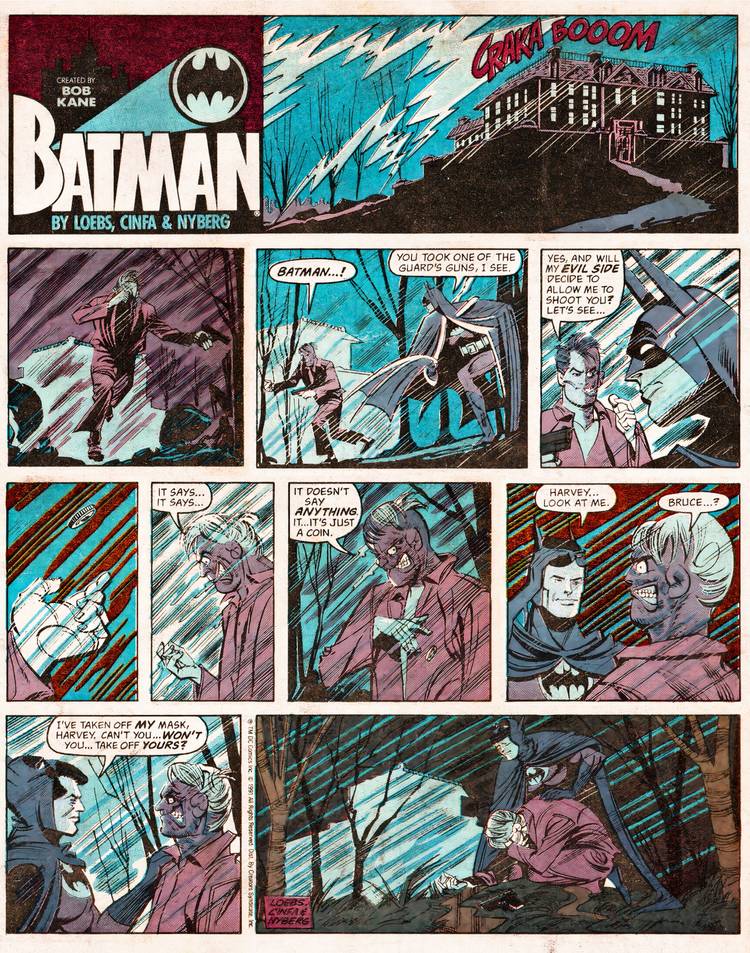 Después de la primera secuencia de Catwoman, Rogers y Collins abandonaron la tira; fueron reemplazados por William Messner-Loebs, Carmine Infantino y John Nyberg. El tono general cambia aún más hacia lo caricaturesco, aunque hay algunos giros divertidos en la tradición clásica de Batman en el camino. Se presentan el Pingüino, el Acertijo, Robin y muchos otros.y la tira hace un trabajo impresionante al construir un arco argumental de larga duración en el que el fiscal de distrito Harvey Dent se transforma en Two-Face. También se reveló que el Joker sobrevivió a su caída desde la torre de la iglesia al final de Ordenanzapero las conexiones con la película del 89 siguieron siendo, en el mejor de los casos, tenues.