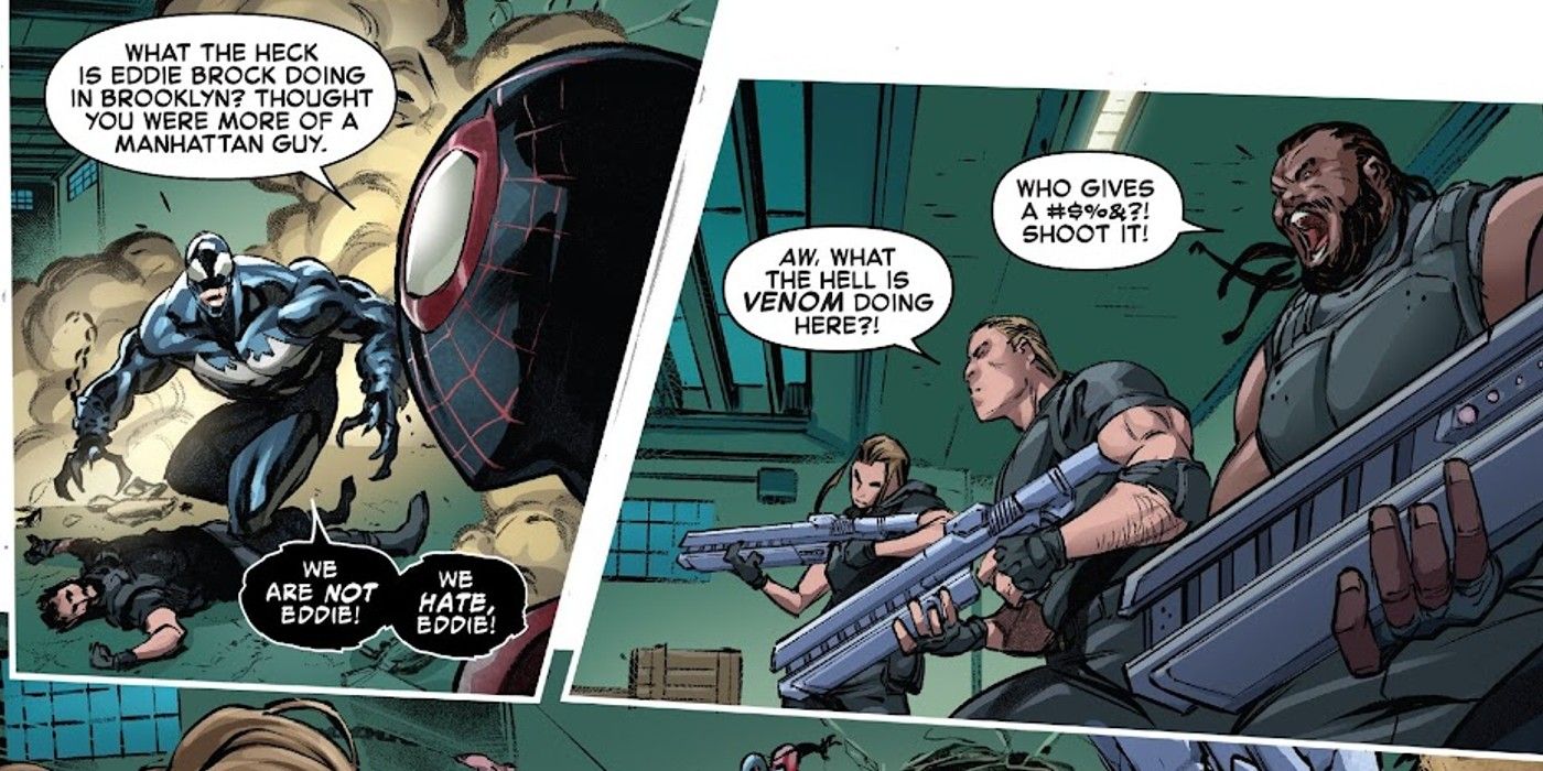 Desafortunadamente, este equipo se va al sur tan pronto como Venom se vuelve demasiado violento con sus matones. Se produce una pelea, pero Miles puede mostrar exactamente qué lo convierte en un mejor candidato para luchar contra Venom en el futuro.