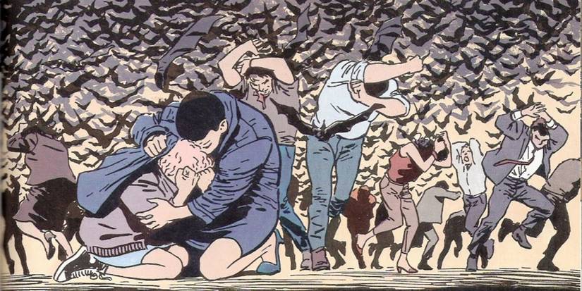 el original Batman: año uno El arco, de Frank Miller y Dave Mazzucchelli, comenzó en 1987 con Batman (1940) #404 y corrió Ordenanza #407. En concreto, en Ordenanza #406, Cuando Batman está inmovilizado y bajo el fuego del GCPD, usa un emisor sónico para llamar a una gran cantidad de murciélagos a su ubicación para cubrir su escape. La escena de los murciélagos ahogando la luz del sol para que Batman pueda escapar es quizás el momento decisivo de toda la película. Batman: año uno arcoayudando a Bruce Wayne a establecer a “Batman” como una figura legendaria en Gotham en una sola salida.