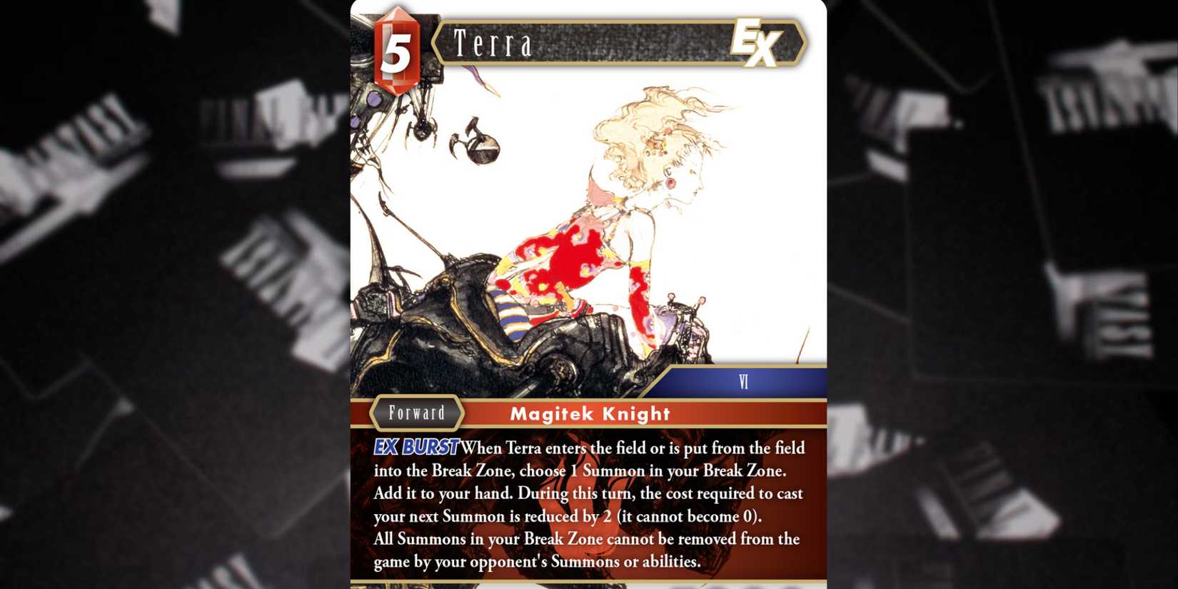 Aunque esto haría que parezca que la resurrección es parte de las habilidades de Terra en ambos juegos, creo que hay una clara distinción aquí. Una carta de invocación no es un personaje, sino que representa una de las poderosas entidades que puede ser convocada por Final Fantasy personajes. La capacidad de Terra para recuperar la convocatoria podría ser un guiño a su lado medio a favor, ya que los espersos son las entidades de convocatoria en FF6. A mí, Eso parece un poco más temático que las criaturas de Terra Revivir en Magia.